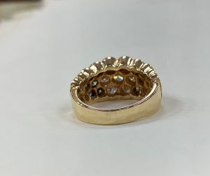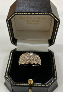 This is an unusual and incredibly eye catching ring. The substantial band and setting is made from 14ct yellow gold. The ring has a central seven stone flower design, the diamonds are set securely and smoothly in a rubbed edge design. Peeling away from the central design are attractive rows of diamonds, 12 on each side of the central flower, totalling 24, in the design of petals on the flower. Approximately 1.50ct of diamonds is set into the 31 stones and the ring has a modern chunky feel to it. This dress ring really is a lovely piece of jewellery. UK size O 1/2, this ring can easily be resized in the workshop on our premises.