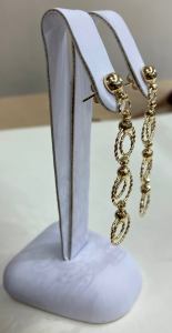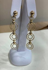 These are stunning 14ct gold twisted wire drop earrings, with the matching necklace available. (24007) The detail and workmanship of the earrings is beautiful. The earrings are made up of eight twisted wire 14ct double circle and bead links. The earrings have 14ct yellow gold post and butterfly fasteners. At the longest point, the earrings hang 48mm and they are 12mm at the widest point. They weigh 4.8g. The rich colour of the 14ct yellow gold is really eye-catching and these are an individual piece of jewellery.