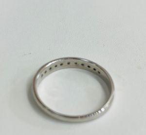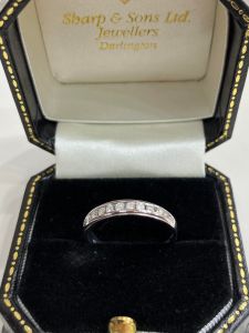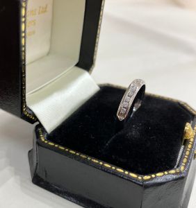 This half eternity ring has ten diamonds set in a channel setting. The stones are equal in size and the total diamond weight is approximately 0.20ct over the ten round brilliant cut stones. The white colour of the gold setting and the stones compliment each other well. The channel setting has a smooth appearance and there are no claws to catch. UK size O, this ring can be resized in the workshop on our premises.