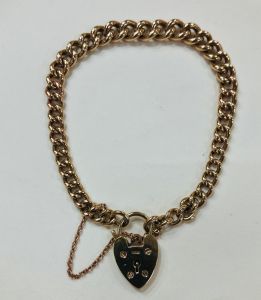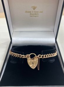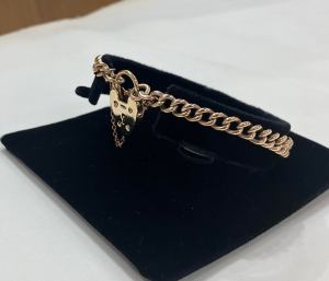 This yellow gold graduated curb link Albert style bracelet fastens with a gold padlock and has a safety chain to make the bracelet very secure. Not only is the bracelet graduated but it is stamped on every link as a sign of quality. The chain measures approximately 7.5 inches/190mm and weighs 19.9g and comes displayed in one of our lovely display boxes.