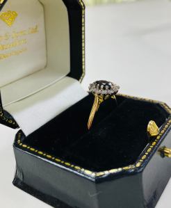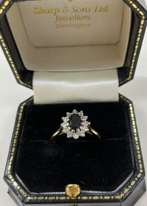 This is an 18ct yellow gold blue sapphire and diamond cluster ring. The ring has been ever popular and a classic style since the 1980’s when the style was worn by Diana, Princess of Wales as an engagement ring. The ring has an 18ct yellow gold shank and the stones are set in a white gold collet which is traditional to enhance the white colour of the diamonds. The central blue sapphire is surrounded by 12 diamonds and to give some idea of scale the head of the ring measures approximately 10mm x 11.5mm. UK size N, this ring can be resized in the workshop on our premises.