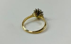 18ct yellow gold sapphire and diamond cluster ring with a central blue sapphire, surrounded by 12 diamonds