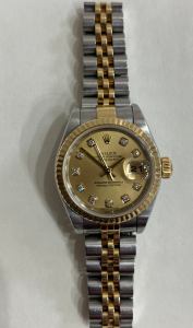 Pre-Owned Rolex Ladies Datejust Oyster Perpetual 18ct Yellow Gold and Stainless Steel Wristwatch with Champagne Diamond dot dial in Excellent Condition with only very minor marks. Model 79173 UK supplied model