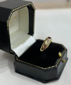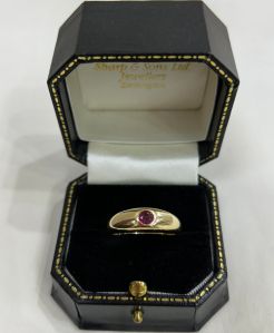 This 18ct solid yellow gold ring is set with a rich red ruby solitaire stone. The stone is cut with many facets which enhances the colour and sparkle. The ruby is invisibly set into the solid head of the ring and due to the smooth nature of the setting, it is a practical ring for everyday wear. The ring weighs 8.7g and the solid head set with the ruby is 5mm thick and has a slight domed appearance. The underside of the setting has a hole under the stone to let natural light into the back of the stone and show off its rich colour. UK size P 1/2, this ring can easily be resized in the workshop on our premises.