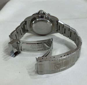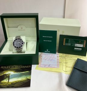The watch comes a Rolex box and outer and Rolex credit card style papers dated 2007, leatherette Rolex document wallet and leatherette travel wallet from place of purchase, original receipt and credit card slip, guarantee manual, Rolex Submariner instruction booklet and a 1-year guarantee from ourselves.