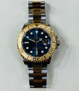 This Rolex Yacht-Master Bi-Metal features a gold bi-directional bezel with oversized numerals and bezel graduations, a blue dial with luminous dots and batons, and a date indicator display at the 3 o’clock position. This is the 16623 model with box and papers dated 2007.