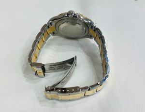 The Yacht-Master was first launched back in 1992. It emulated the Submariner model with similar hands and layout however whilst the Submariner is famous for its practicality and utilitarianism, the Yacht-Master was seen as more opulent and worn as mainly a piece of jewellery to impress. The 16623 was launching in 2005 and despite its opulent exterior is an extremely capable model underneath, sharing the same 3135 calibre Swiss movement as the Submariner. It has white luminescent dot hour markers and the tough sapphire crystal which protects the dial remains scratch resistant under the most arduous conditions. The watch has a date window at the 3 o’ clock position and date changes at midnight and can be rapidly adjusted. The watch is waterproof to a depth of 100m (330 feet). The trip lock screw-down crown, a triple safety device, is protected against accidents by seamless shoulders cut in solid metal. The flat three piece solid link bracelet is made from stainless steel Oystersteel and 18ct solid yellow gold. The bracelet has a fold over clasp with deployant buckle for safe fastening.