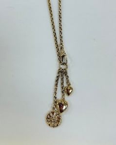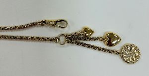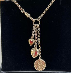 This is eye-catching bespoke necklace and pendants. The 9ct yellow gold belcher chain is Victorian, has a faceted figure of eight finish to each link and hangs 22” (560 mm) in length. The finished length of the necklace however is 24”(610mm) as the necklace has three 9ct yellow gold pendants which hang from a oversized jump ring into which the swivel fastener hangs. The longest pendant is a yellow gold rose charm. The second pendant is a bulbus polished heart and the shortest pendant is a small polished heart. The item weighs 14.2g in total. The detail and workmanship of the pendant is lovely and being bespoke, it is not something you will see in other jewellers windows.