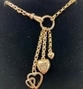 This is eye-catching bespoke necklace and pendants. The 9ct yellow gold belcher chain is Victorian, has a faceted figure of eight finish to each link and hangs 18” (457mm) in length. The finished length of the necklace however is 22”(558mm) as the necklace has three 9ct yellow gold pendants which hang from a oversized jump ring into which the swivel fastener hangs. The longest pendant is a double inter-locking heart. The second pendant is a bulbus filigree heart and the shortest pendant is a small polished heart. The detail and workmanship of the pendant is lovely and being bespoke, it is not something you will see in other jewellers windows.