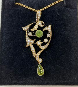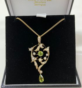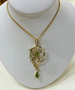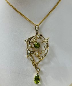 Pre-Owned 15ct yellow gold Victorian peridot and seed pearl pendant on a new 9ct curb chain measuring 457mm /18 inches