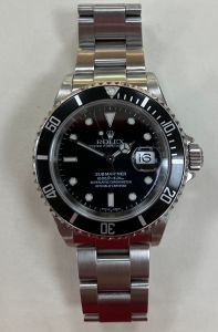 This Rolex Submariner Date Stainless Steel features a black unidirectional bezel with numerals and bezel graduations, a black dial with luminous dots and batons, and a date indicator display at the 3 o’clock position. This is the 16610 model with box and papers dated 2004. It has Rolex service papers dated 2022.