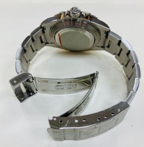 The Submariner Date is a watch whose elegance belies its technical capabilities as a divers watch. The trip lock crown, a triple safety device, is protected against accidents by seamless shoulders cut in solid metal. The date changes at midnight and can be rapidly adjusted. The graduated Oyster bracelet has extension links so that it can be worn over a light diving suit and is fastened by a Fliplock safety clasp. A tough sapphire crystal remains scratch resistant under the most arduous conditions. The watch is waterproof to a depth of 300m (1000 feet). The revolving bezel incorporates a ratchet and can only be turned anti clockwise for reliable checking of decompression times. Truly a handsome watch, practical stylish for every occasion.