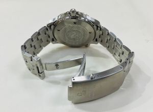 The Seamaster collection to which this watch belongs pays tribute to the maritime heritage of the Omega brand. The watch is waterproof to a depth of 300m (1000 feet), has a helium escape valve for long periods spent underwater and a revolving bezel that can only rotate anti-clockwise for reliable checking of dive and decompression times. The watch has a screw-in crown that screws directly into the case, providing reliable water resistance that a divers watch needs. The watch has a domed scratch-resistant crystal with an anti-reflective treatment, a highly durable cover over the dial. The solid link bracelet has a push button release fold over clasp which has a divers extension to the bracelet, useful when wearing over a wetsuit. This watch is classified as a chronometer, a watch whose movement has obtained an official rate certificate from the COSC (Official Swiss Chronometer Testing Institute) after having passed precision tests in different positions and at different temperatures. These tests are conducted over a 15-day period.