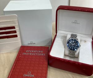 The watch comes with the original Omega box and outer (in fair condition), Omega instruction booklet, Omega chronometer and warranty cards dated 2004 with an Omega leatherette document holder and it has a 1-year warranty from ourselves.