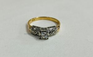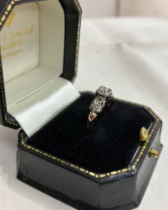 This 18ct yellow gold and platinum three stone diamond ring is a lovely pre-owned piece. The shank of the ring is 18ct yellow gold and the head of the ring provides a lovely contrast as it is platinum. Set into the fancy filigree cross over design are three diamonds. The head has a stepped design with the centre stone set higher than the two outer stones. The centre stone is protected by the setting which has a square appearance. The ring also has fancy carved side settings. The head of the ring measures approximately 15mm x 5mm and the central stone is set in the higher part of the setting which is 6.5mm in height. The ring weighs 3g. UK size N, this ring can easily be resized in the workshop on our premises.