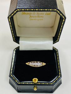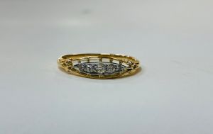 This 18ct gold five stone diamond ring dates from the Edwardian era, it is a simple yet attractive design. The head of the ring is boat shaped and the five old cut diamonds are set into a white head, which shows off the stones and makes them sparkle. The stones are graduated and set into a pretty filigree wire and bead setting. The head of the ring measures approximately 16.5mm x 5mm and the ring weighs 2.2g. UK size P, this ring can easily be resized in the workshop on our premises.
