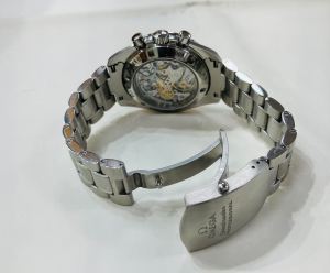 The 42mm stainless steel cases houses an Omega 1863 calibre manual winding chronograph movement with a rhodium plated finish. Iconic descendant of the calibre that was worn on the moon, this model has a power reserve of 48 hours. It is in full working order. The transparent case back to the watch allows the movement to be seen.