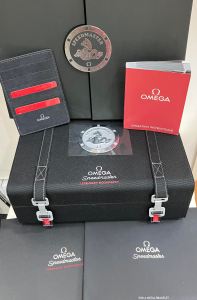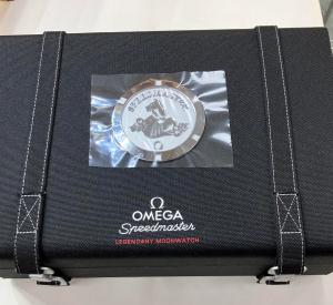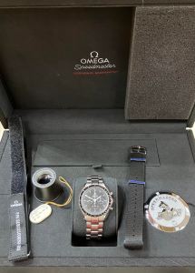 The watch comes with the original Omega double door box including outer, and cardboard Omega outer, special Omega ‘Moonwatch’ presentation box, two operating instructions manuals, ‘Moonwatch’ history information booklet, pictograms and warranty card dated 2019 in a red suedette document wallet. The ‘Moonwatch’ presentation box also contains Omega swing ticket, Omega NATO and material straps, Omega tool to change the straps, Omega jewellers loupe and Speedmaster disk.