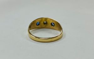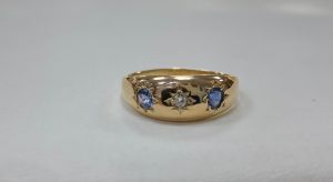 18ct yellow gold three stone boat shaped ring set with two cornflower blue sapphires and a diamond to the centre