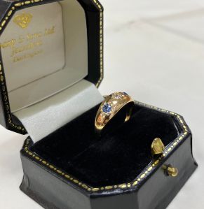 This 18ct yellow gold boat shaped three stone ring is set with two beautiful cornflower blue sapphires, their colour is really stunning. The outer sapphires flank a central diamond and all three stones are surrounded by a star cut style setting. The under setting of the head to the stones is open, letting light under the stones to further enhance their colour. To give some idea of scale the head is approximately 15mm x 8mm. UK size M1/2 this ring can easily be resized in the workshop on our premises.
