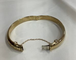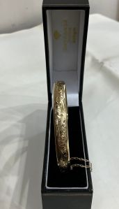 This 9ct yellow gold engraved bangle is of classic design. The bangle is half engraved with a leaf and scroll style pattern and it is in good condition. The bangle is hinged and has a concealed tongue clasp as well as a safety chain. The diameter of the bangle is approximately 64mm x 60mm and is 4mm wide. It is oval in shape and very smooth on the inside making it comfortable to wear. It is a lovely piece of jewellery.