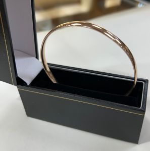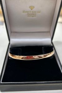 This 9ct rose gold polished bangle is of classic design. The bangle is made from solid gold wire with no signs of any dents. It has a domed top and is flat inside. The bangle will slip over your wrist and is meant to hang loose. The diameter of the bangle is approximately 70mm x 65mm and is 6mm wide. It weighs approximately 19g. It is oval in shape and very smooth on the inside making it comfortable to wear.