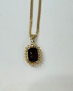 Pre-Owned 9ct Yellow Gold Single Stone Garnet Cushion Shaped Pendant set in a milgrain edge mount on a 457mm (18″) Yellow Gold Curb Chain