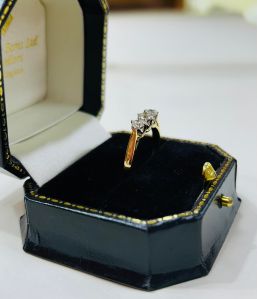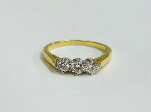 This 18ct yellow gold trilogy ring has approximately 0.55 carats of diamonds across the three brilliant cut stones. The three stones are equal in size. The diamonds are claw set in a 18ct white gold head, to enhance the lovely white colour of the stones. To give some idea of scale the head measures approximately 4mm x 13mm. UK size O, this ring can easily be resized in the workshop on our premises.