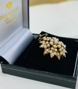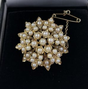 The craftsmanship that has been used to make this brooch is fantastic. From the Victorian era, the brooch has 55 seed pearls that are graduated in size and they radiate out in a flower head design from a central seven pearl cluster. The pearls are set in 15ct gold, which has a lovely rich colour, a perfect contrast to the creamy pearls. The brooch has a pendant loop to the back of it, to allow the brooch to be worn on a chain as a pendant. It also has a safety pin style safety chain and weighs 8.4g. To give an idea of scale, it measures 29 x 29mm at its widest points.