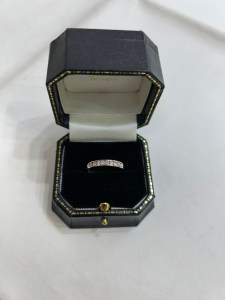 This half eternity ring has ten diamonds set in a channel setting. The stones are equal in size and the total diamond weight is approximately 0.33ct over the ten round brilliant cut stones. The rich colour of the 9ct gold setting and the white of the stones compliment each other well. The channel setting has a smooth appearance and there are no claws to catch. To give an idea of scale the stones are set over a 19mm head and the width is approximately 3mm. UK size M , this ring can be resized in the workshop on our premises.