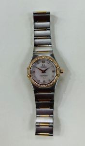 The 22.5mm stainless steel and 18ct rose gold case houses an Omega 1456 quartz precision movement with rhodium plated finish. It is in full working order.