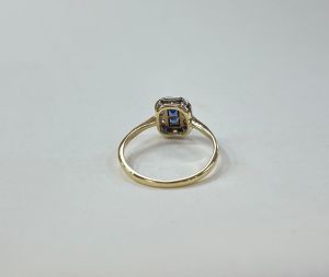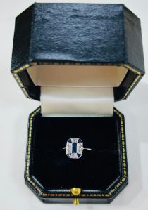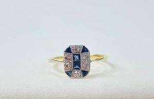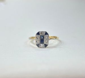 The is a striking ring – an Edwardian era sapphire and diamond plaque ring. Typical of the Edwardian era, the name plaque ring refers to the flat, often smooth setting of the stones. This ring has a six diamonds and six cornflower blue sapphires set in platinum and it really is a beautiful design. Two princess cut sapphires are set to the centre of the ring with the 4 corners of the head also set with triangle shaped sapphires. The white of the six diamonds set in platinum compliments the rich colour of the 18ct gold shank. To give some idea of scale the head of the ring measures 9.5mm x 8mm. UK size L1/2, this ring can easily be resized in the workshop on our premises.