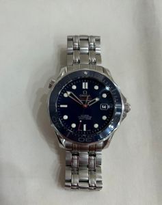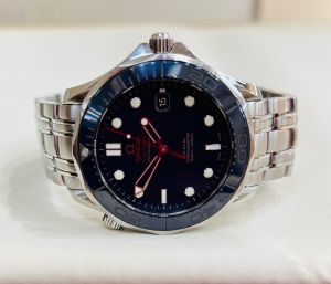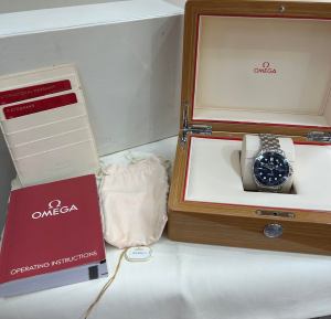 This Omega Seamaster Professional Co-Axial Diver 300m features an blue ceramic unidirectional rotating bezel, blue dial with luminous dots and batons and a date indicator display at the 3 o’clock position. This is the 212.30.41.20.03.001 model with box and papers dated 2017.