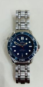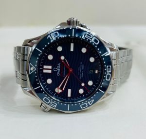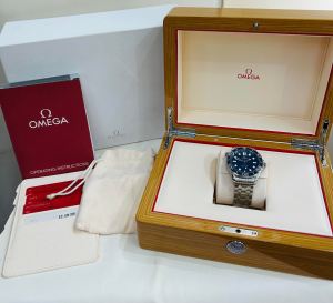 This Omega Seamaster Diver 300 Co-Axial features an blue unidirectional rotating ceramic bezel, blue wave dial with luminous dots and batons and a date indicator display at the 6 o’clock position. This is the 210.30.42.20.03.001 model with box and papers dated September 2020.