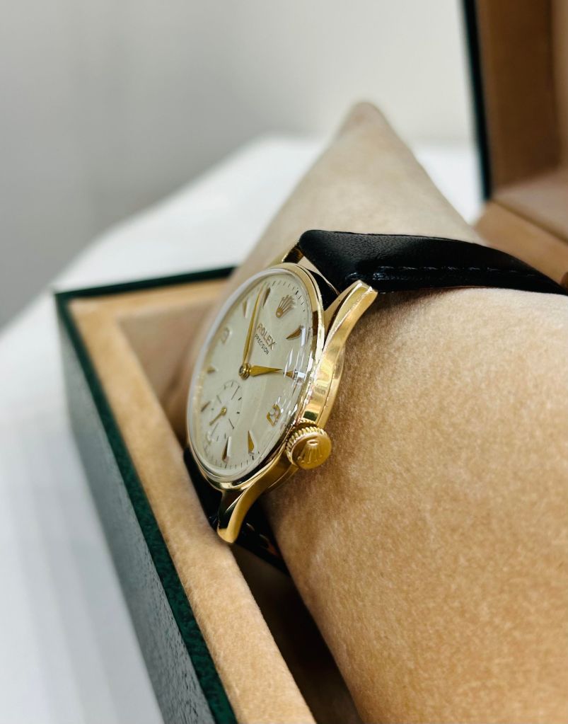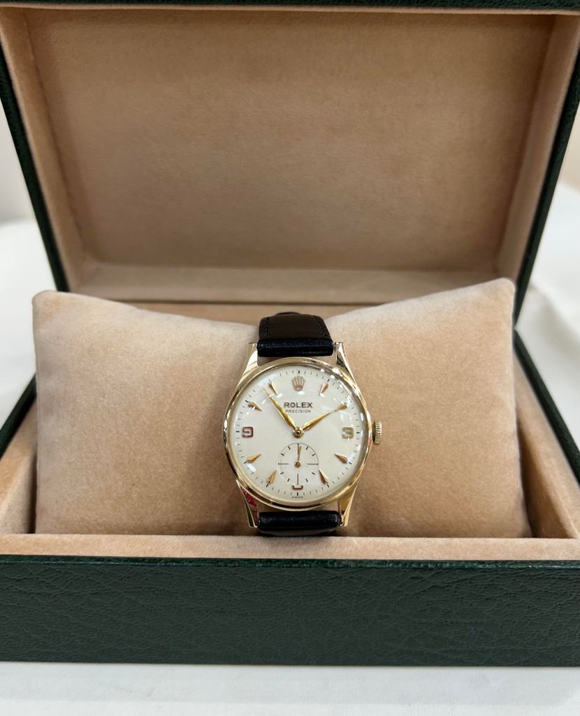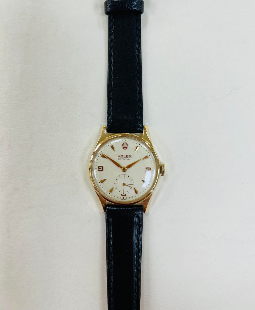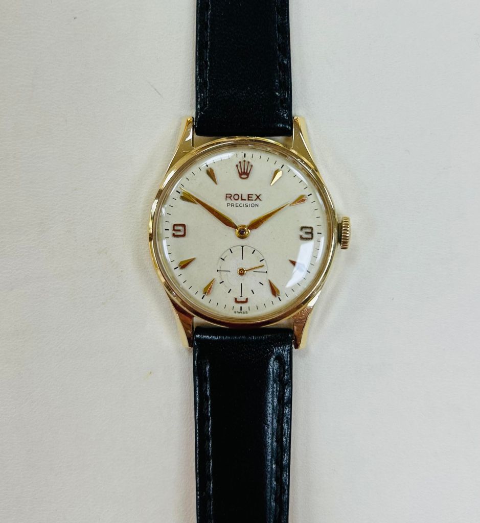 This is a 9ct yellow gold pre-owned Rolex Precision strap watch with model number 12868. It has a mechanical winding 1220 movement. It has a off white coloured dial with gilt hands, Arabic and numeral hour markers as well as a small seconds dial just above the 6 o’clock position. It comes on a high quality new generic black leather strap. To give an idea of scale the watch case measures approximately 33 x 31mm. It is hallmarked 9ct gold from the 1960’s. The case back is free from personalised engraving. This watch is serviced and sold with a 2-year guarantee from ourselves. It is supplied in a generic suedette lined watch box.
