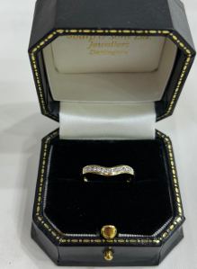 This half eternity ring has eleven diamonds set in a channel setting. The stones are equal in size and the total diamond weight is approximately 0.20ct over the eleven round brilliant cut stones. The rich colour of the 18ct gold setting and the white of the stones compliment each other well. The channel setting has a smooth appearance and there are no claws to catch. The ring is shaped into a gentle curve, it allow a smooth fit when set up against a solitaire ring. To give an idea of scale the stones are set over a 17mm head and the width is approximately 3mm. UK size L , this ring can be resized in the workshop on our premises.