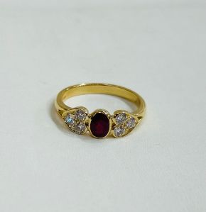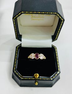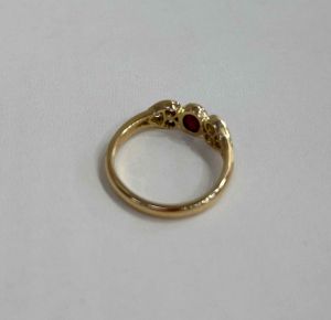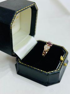 This is a striking ring. The ruby to the centre is a beautiful ‘blood’ red colour. It is has a smooth and secure rubbed edge setting and the setting of the stone is low and flat. It is extremely comfortable to wear. The centre ruby is surrounded by six diamonds which are set in heart shapes, three to each side of the ruby. The ruby is approximately 0.65ct and the six diamonds total weight is approximately 0.30ct. the setting is 18ct yellow gold with a substantial shank. To give some idea of scale the head of the ring measures 17mm x 6.5mm. UK size N, this ring can easily be resized in the workshop on our premises.