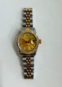Introduced in 1945 the Oyster Perpetual Datejust was the first wristwatch to feature a date display, clearly visible with a special magnifying Cyclops lens. The official chronometer rating is given to this self winding movement housed in the 26mm steel case with 18ct gold fluted bezel. A sapphire crystal protects the champagne baton dial, which is a classic design. The watch is waterproof to 100m/330 feet. The Jubilee bracelet with fold over clasp is made from 18ct yellow gold and 904L stainless steel. Rolex use 904L steel as it is a super alloy and which marries perfectly with the 18ct gold. The steel is extremely tough and highly polishable, normally reserved for the chemical industry where maximum resistance against corrosion is essential.