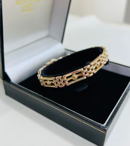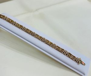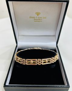 This is an Edwardian three bar gate bracelet made from 9ct yellow gold. The three bar links have a faceted finish and the centre of each of the eight, three bar links is finished with a dot and rope design. It fastens using a concealed tongue which gives a seamless finished to the bracelet. It has two figure of eight clasps for extra safety. It measures approximately 200mm/ 7 3/4”. Considering the age of the bracelet it is in excellent condition and is not dented. It really is a lovely piece of jewellery.