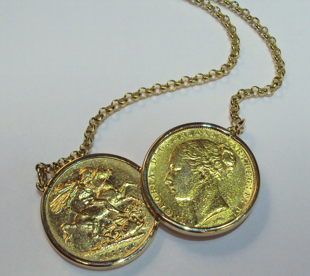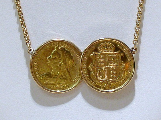 This stunning necklace is handmade by Mr Sharp in our own jewellery workshop on our premises. In a simple mount, two 22 carat gold half sovereigns overlap and are held by a heavyweight 9ct gold belcher chain fastening with a trigger catch. The necklace shown here is 16 inches in length.
