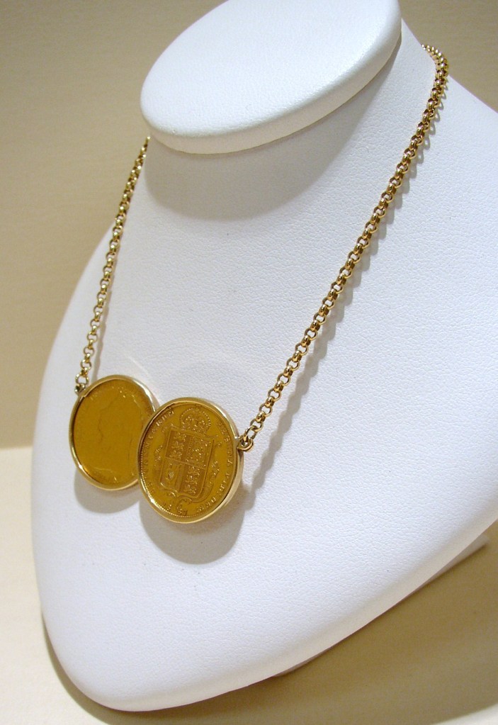 The necklace shown in the photograph is to give an example, when you come to visit us it may be a new version with different half sovereigns in the mounts.